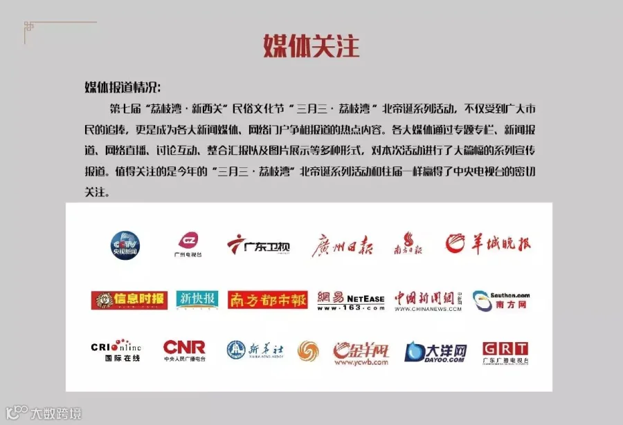 第七届“荔枝湾·新西关”民俗文化节“三月三·荔枝湾”北帝诞不仅受到广大市民的追捧,更是成为各大新闻媒体、网络门户争相报道的热点内容。各大媒体通过专题专栏、新闻报道、网络直播、讨论互动、整合汇报以及图片展示等多种形式对本次活动进行的大篇幅的系列宣传报道。今年的“三月三·荔枝湾”北帝诞系列活动和往届一样赢得了中央电视台的密切关注,并在各界人士及机构的大力支持下,取得完满成功。