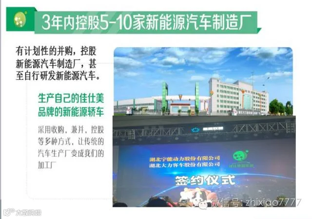 与福特,湖北大力客车厂等合作,将生产自己的佳仕美品牌的新能源轿车,采取收购,并购,控股等多种方式,让传统的汽车生产厂变成我们的加工厂。