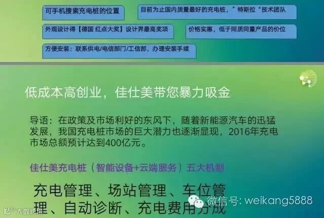 佳仕美配合有代理的城市,与地方政府对接,建设充电桩为会员服务。这是一个国家补贴,几乎是没有成本的管道生意!有实力的代理商可参与充电桩建设,或者由佳仕美新能源集团出资建设!