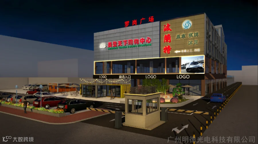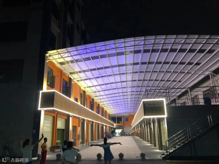 罗岗广场商业街,我们采用了冷色的线条灯、射灯与暖色投光灯,搭配了可以变换颜色的投光灯。与墙体的颜色相呼应,颜色不会杂乱无章,创造了一种置身于星空般的高级感,让人驻足往返。