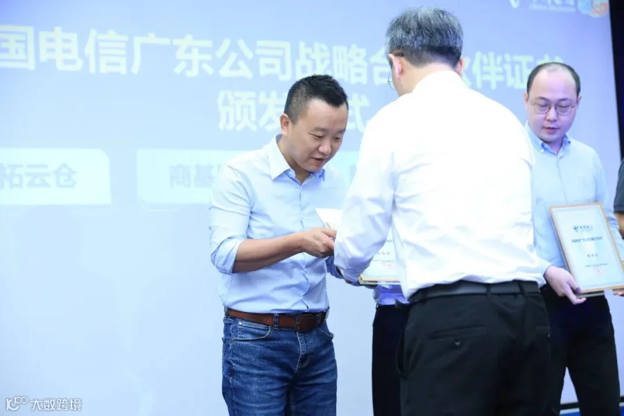 本次大会上中国电信广东公司工业行业事业部总经理张志伟、中国电信广东公司政企部产品总监沈朝阳为壹拓云仓、商基网络、新核云、广州旭丰、卡奥斯、树根互联、广州浩传、海康威视等企业颁发战略合作伙伴证书。