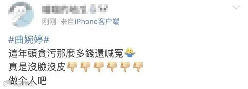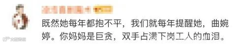 更有人指出,正义的确终将会到来,但曲婉婷不配说这句话,她的母亲手里沾满了下岗工人的血泪。