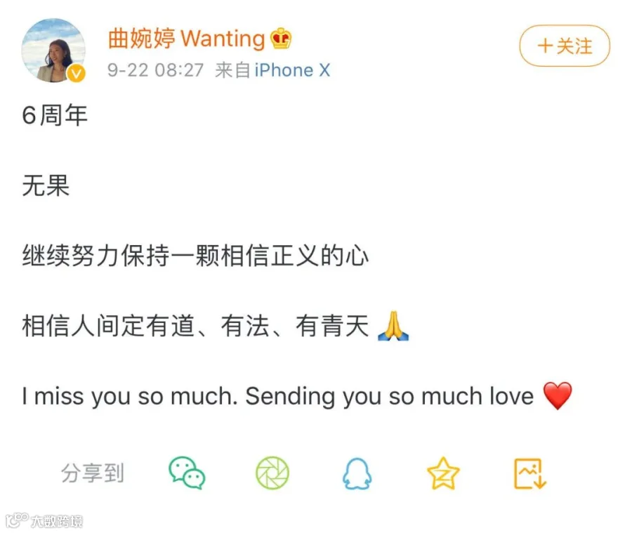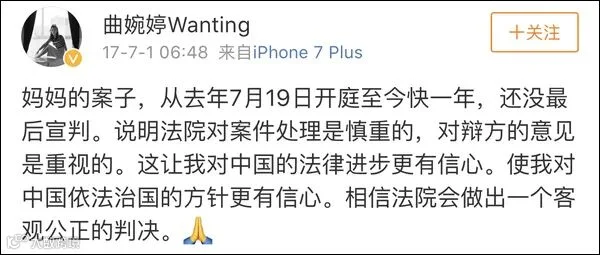 自母亲受审后,曲婉婷常住在加拿大温哥华,相关消息寥寥无几,但时不时会在微博上,为母亲发声“喊冤”。