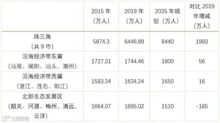 根据广东2035国土空间规划,未来15年,珠三角常住人口将从6300多万增加到8440万,新增接近2000万人;沿海经济东翼和西翼合计新增约70万人,而北部生态发展区则要减少180多万人。