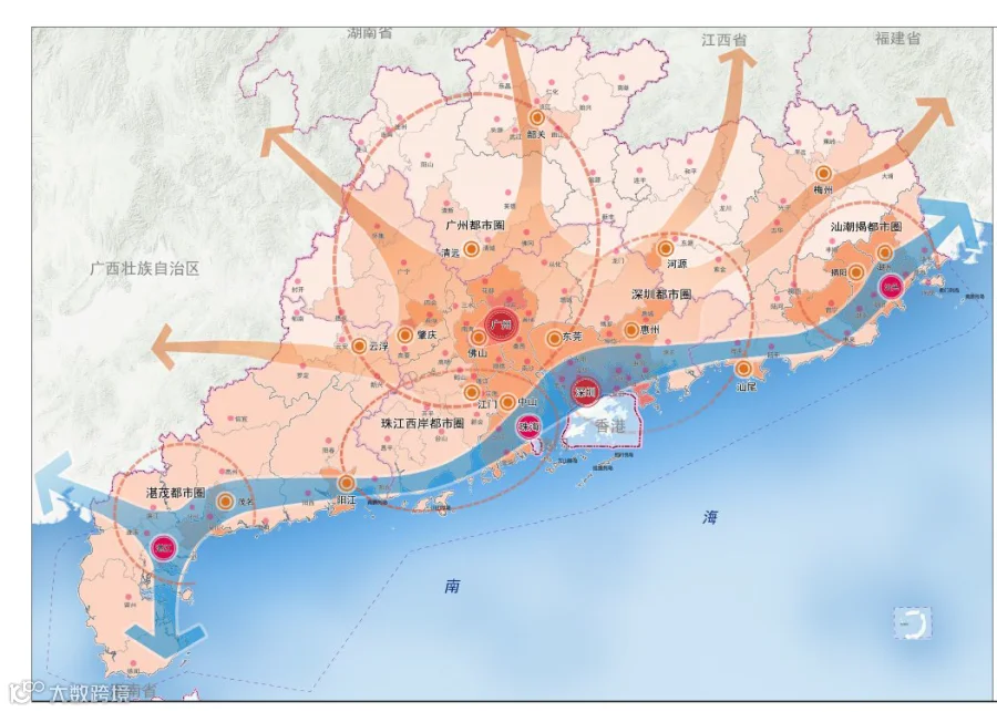 广州都市圈:广州、佛山、肇庆+清远、韶关、云浮。 深圳都市圈:深圳、东莞、惠州+汕尾,河源。 珠江口西岸都市圈:珠海、中山、江门+阳江。 汕潮揭都市圈:汕头、潮州、揭阳。 湛茂:湛江、茂名。