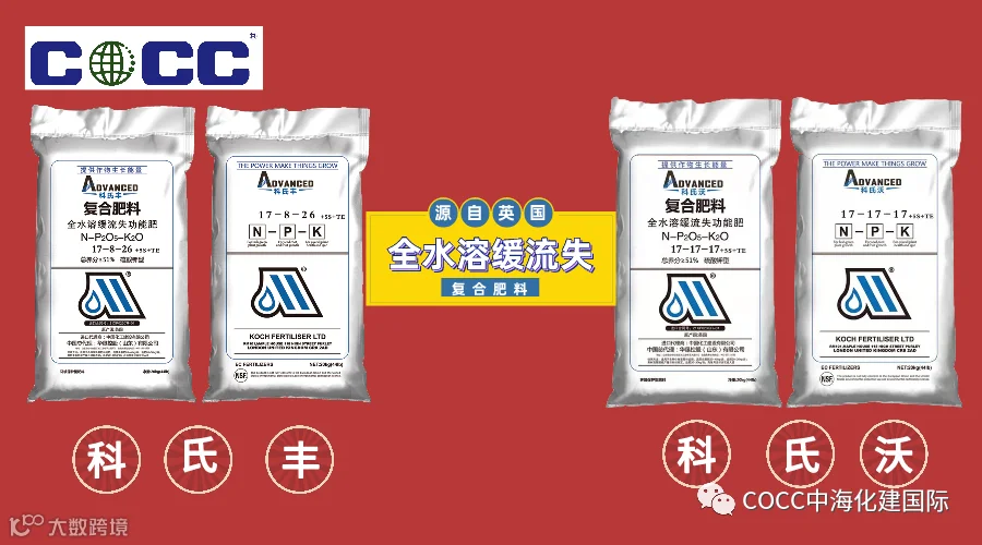 COCC中海化建国际科氏复合肥是一款英国进口的全水溶复合肥,三个含量科氏丰17-8-26,科氏沃17-17-17,科氏钾0-0-52.