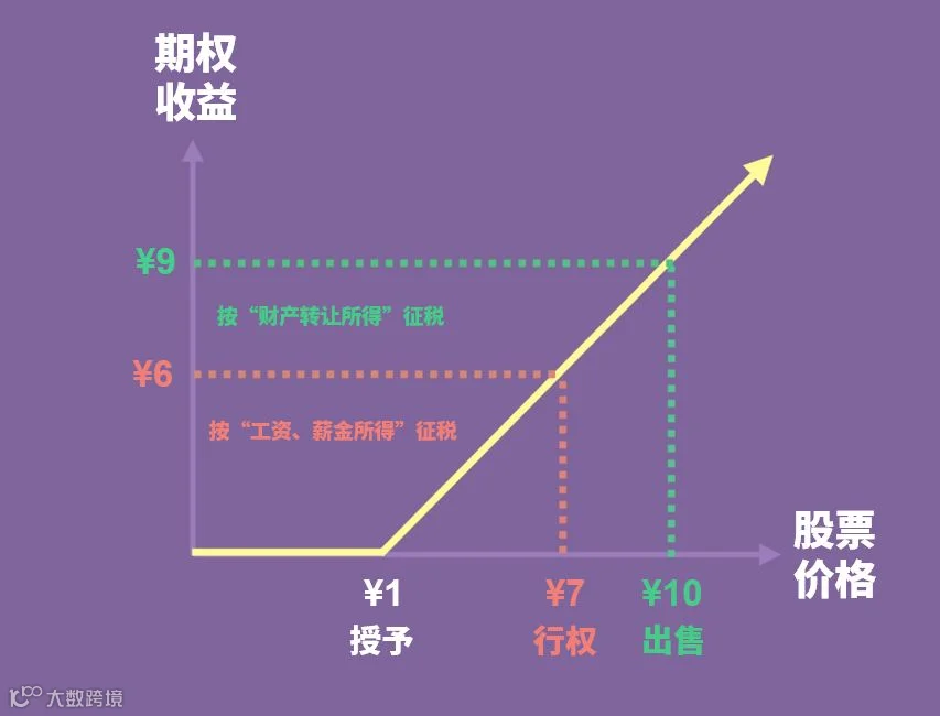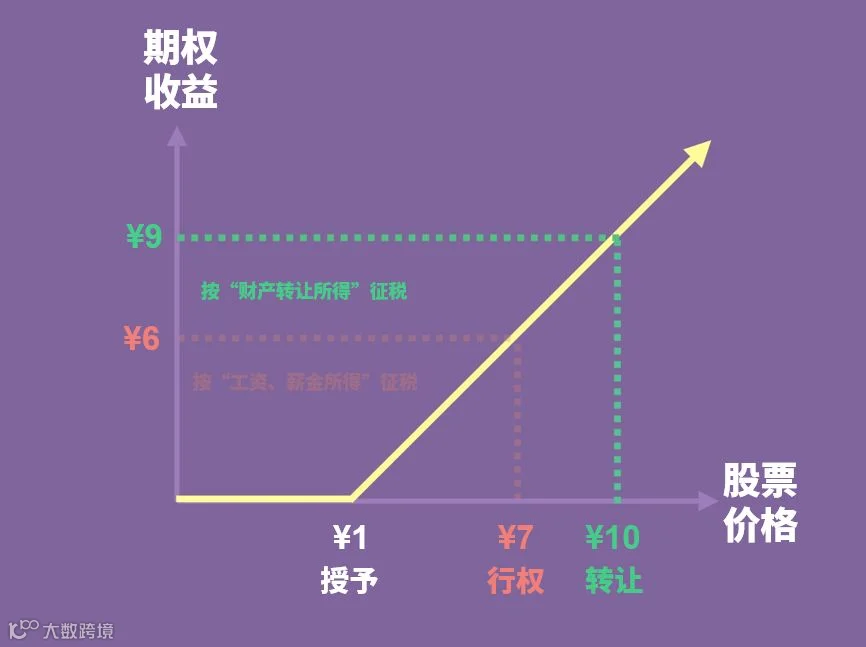 而Marry在行权后出售股票的收益,则会按照“财产转让所得”进行征税。(下图绿色部分):