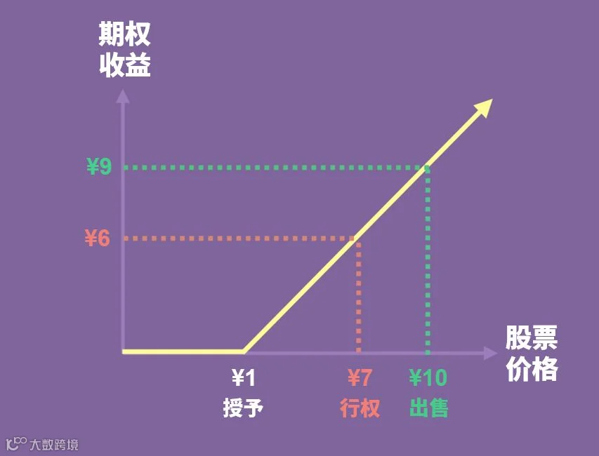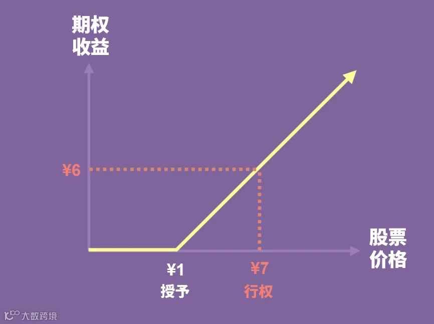 如果 Marry 决定在股价为7元时行使权利,她的行权收益是 6 元。这是 7 元的股价减去她 1 元的行权价得出来的: