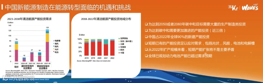 左边这张图可以看到,按照现在温和转型模型假设的投资需求的角度出发,每年我们大概需要160亿-370亿美元的新能源类产能投资,而2022年实际数据已经达到790亿美元。这个产能甚至超过了2023-2026零碳转型模型假设投资需求。