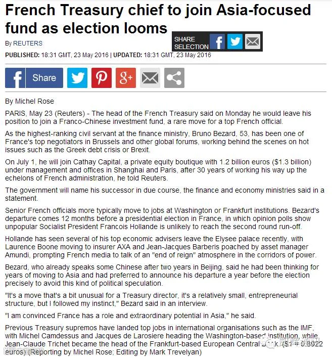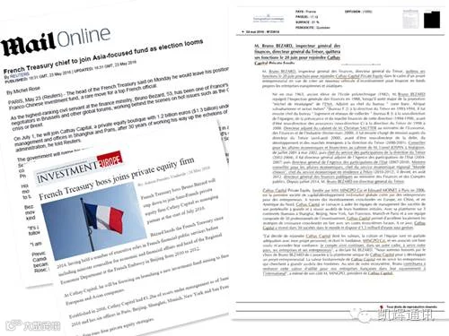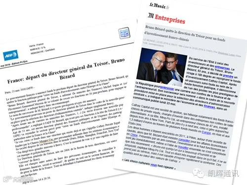 法国巴黎时间2016年5月23日晚,法国财政部副部长贝宇诺 (Bruno Bezard)先生正式向法国政府提请辞呈,宣布将于今年7月加入凯辉基金担任管理合伙人。