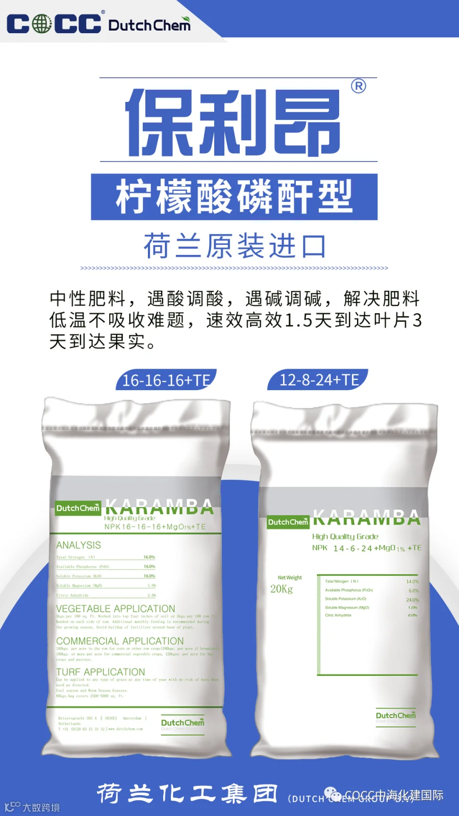 保利昂®全水溶柠檬酸磷型复合肥料是一款从荷兰化工集团进口的中性肥料,可以解决肥料低温不吸收的难题,速效+高效,1.5天可以到达叶片,3天可以到达果实。