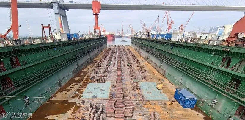 “飞龙山”浮船坞是广东中远海运重工长期稳定开展船舶修理与改装业务的核心设施。由于常年服役,其坞体部分钢结构腐蚀、坞墩承载能力日渐不足、压载管路存在老化渗漏隐患。为进一步适配绿色修船作业需求,广东中远海运重工正式启动该浮船坞的移坞维修改造工程。