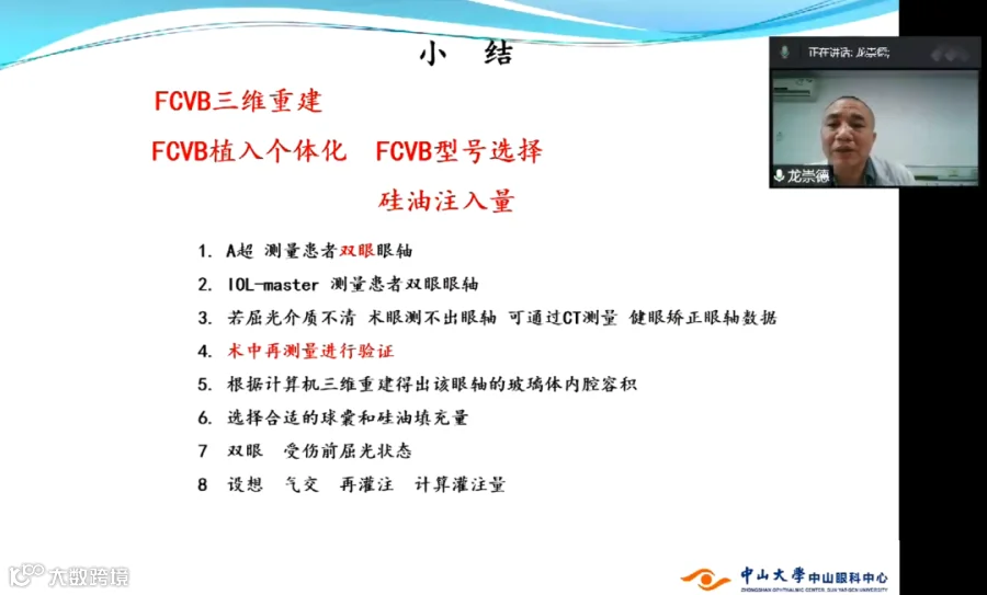 因疫情防控影响,龙教授线上分享FCVB三维重建应用体会,提到眼外伤如何做到眼球FCVB植入个体化,通过计算机三维重建+ CT平扫位和IOLmaster/A超精准评估外伤患者的玻璃体腔体积。