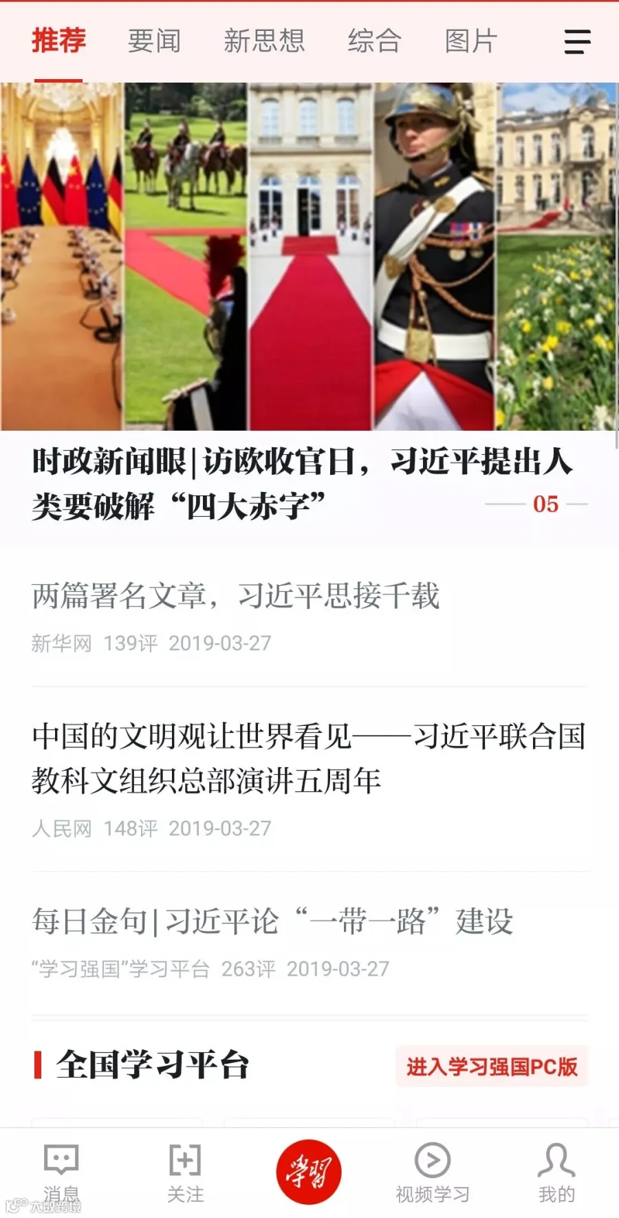 打开“学习强国”的首页,映入眼帘的是跟别的新闻APP并无二致的新闻界面,比如今天的是这样的: