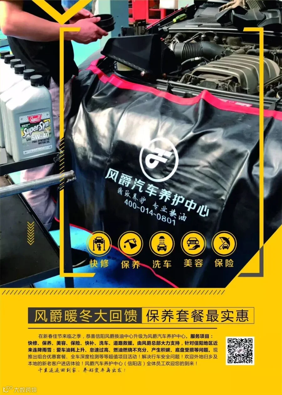 在新春佳节来临之季,恭喜信阳风爵换油中心升级为风爵汽车养护中心(信阳店)。服务项目:快修,保养,美容,保险,快补,洗车,道路救援。
