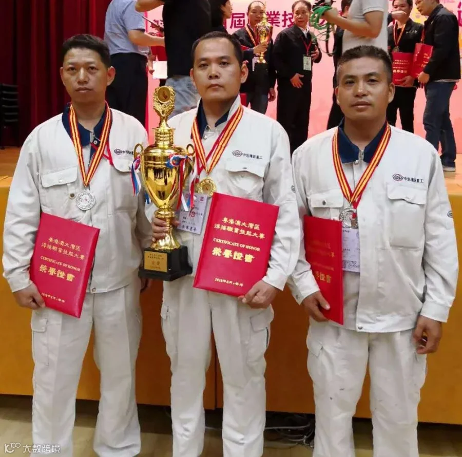 广东中远海运重工派出3名焊接技师均长期服务于企业的高端船舶和海洋工程产品焊接制造生产线。经过在焊接生产一线十余年高标准严要求的磨练,他们的焊接技术出色而稳定。广东中远海运重工高度重视首届大湾区焊接技能竞赛,公司工会和人力资源部门根据东莞市总工会的要求组成工作小组,积极选派参赛选手,并在赛前针对比赛科目进行了为期一个月的高标准培训。在比赛中,张民涛、赵呈勇、孟武辉发挥精湛技术,充分展现了广东中远海运重工人的风采,最终以高分摘金夺银,受到评委和业界代表的高度赞赏。