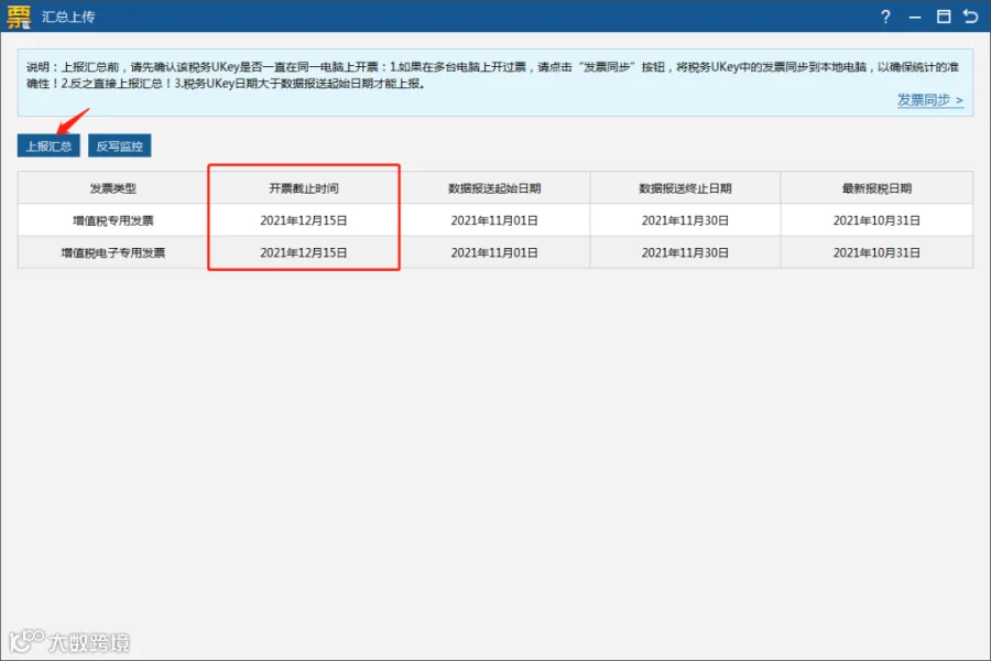 弹出“汇总上传”界面,点击【上报汇总】(抄税)。