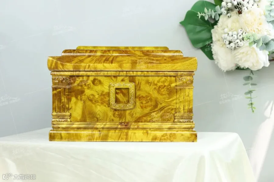 5、黄金樟:黄金樟是缅甸三大国宝之一,其木质特性具有极重的油性和铁性,使之防腐防潮、防虫防酸,可经年不朽。黄金樟制作的骨灰盒呈瑰丽的金黄色,不同角度下盒身流光溢彩,具有天然香气,其风格尊贵独特,适合德高望重、对品质有追求的逝者。