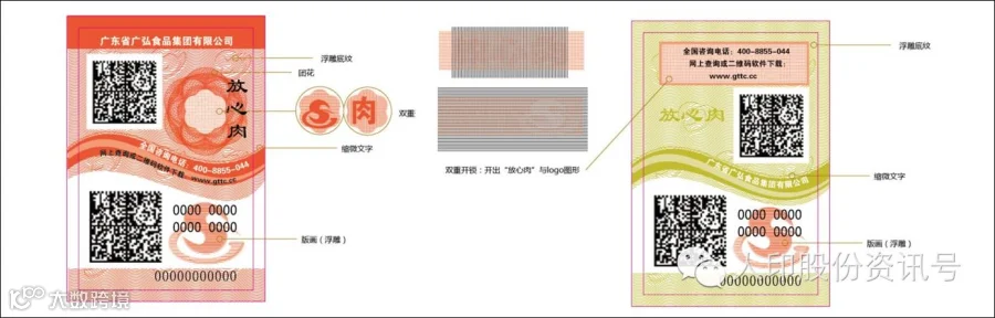 主要使用的防伪技术:底纹+团花防伪、刮刮银、荧光油墨印刷、彩虹渐变码。