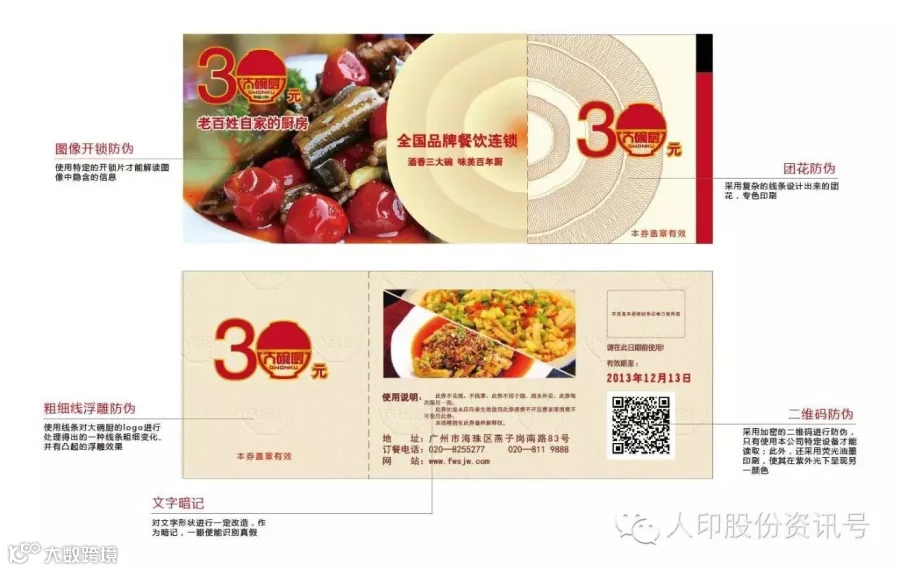 主要使用的防伪技术:图像开锁防伪、粗细线浮雕防伪、文字暗记、二维码防伪、团花防伪。