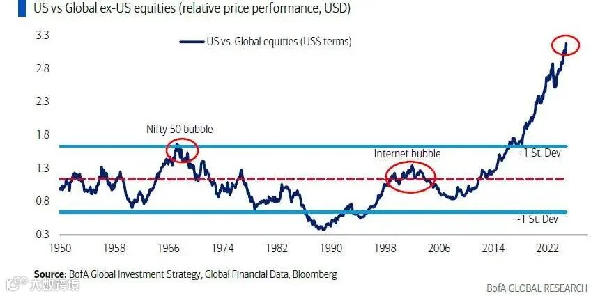 自本月初特朗普/共和党意外获得压倒性完胜以来,全球股市的命运出现了显著变化:美国股市暴涨,飙升 1.8 万亿美元,而另一方面,新兴市场市值蒸发了 5000 亿美元,EAFE(欧洲、澳大利亚和远东,下同)市值下跌了 0.6 万亿美元。美股一枝独秀,也就是投资者全盘押注特朗普 2.0,这相当于“美国例外主义”, 因此配置者很难称美国资产价格狂飙达到顶峰,但随着美元(指实际汇率)目前处于 55 年来的最高水平,美国股市相对于全球股市的领先比率处于 75 年来的最高水平(见图表1)。