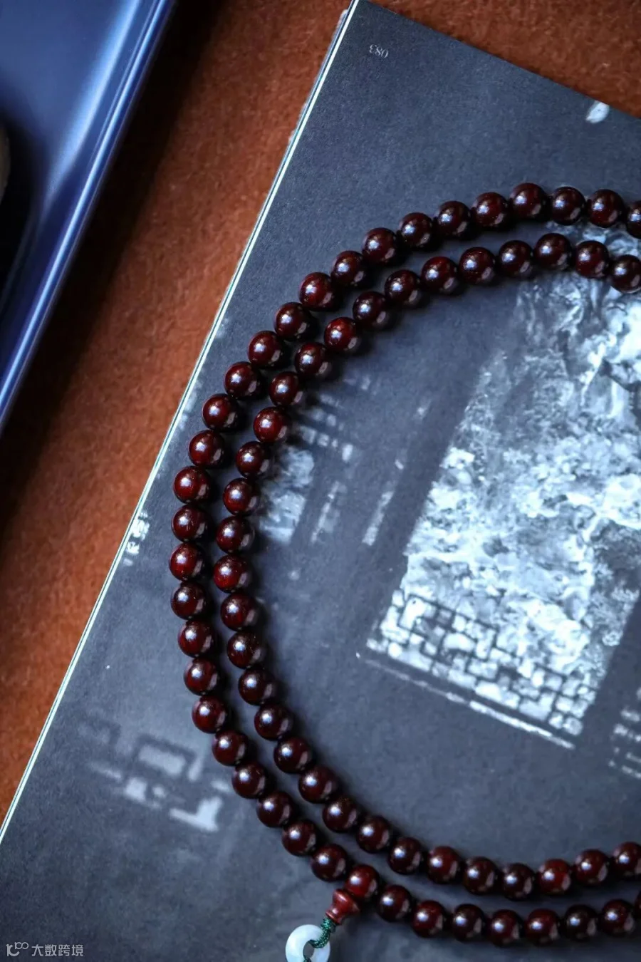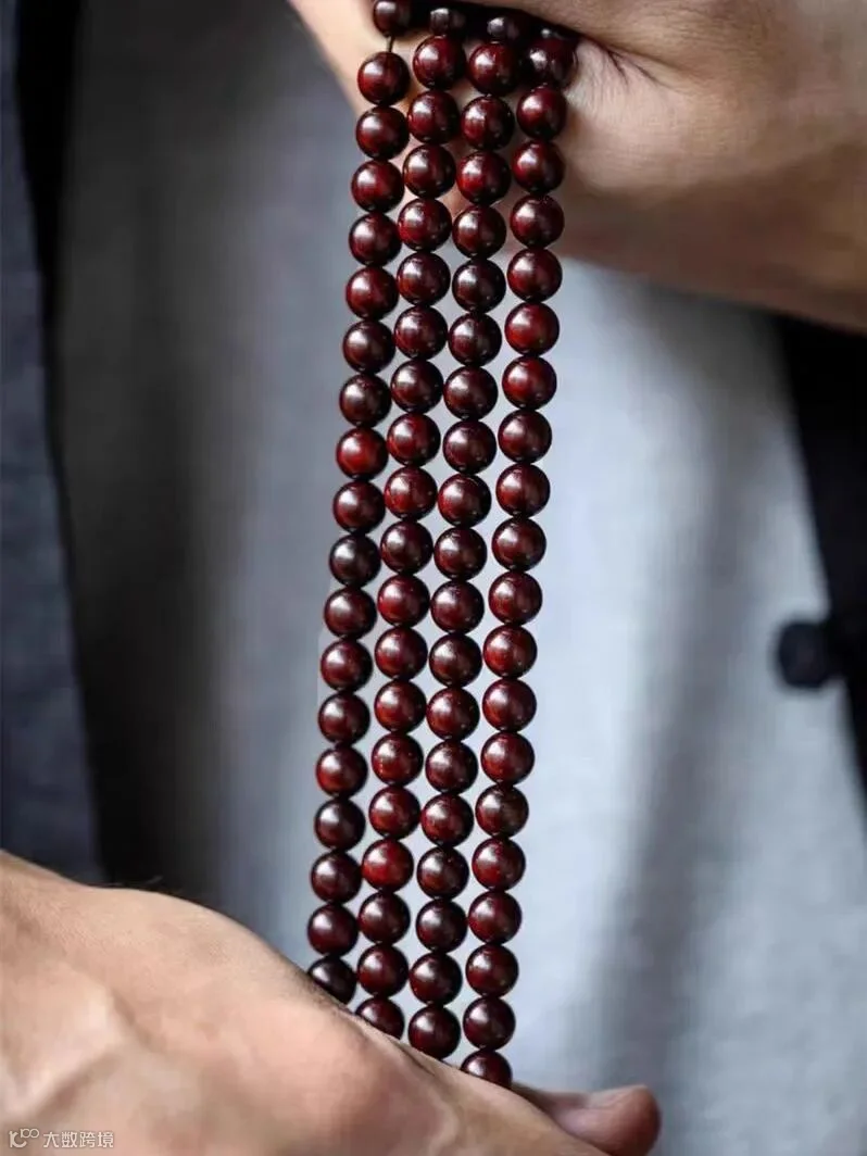 小叶紫檀念珠经过细致的盘玩后,会慢慢呈现玫瑰红到鸡血红到珍珠黑的奇妙变化,从而变得油亮,自有一种禅意和佛性,寓意美好。