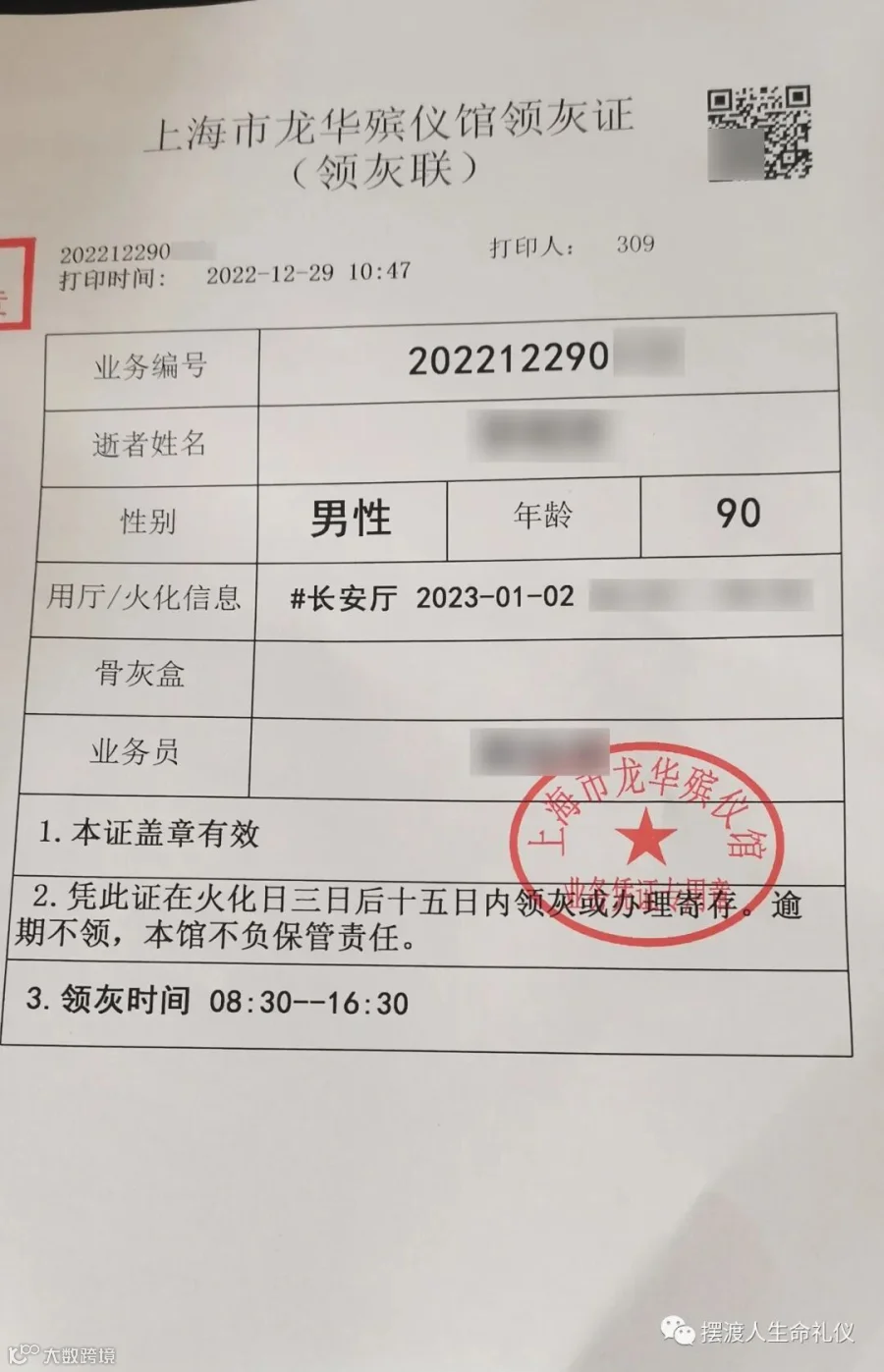 丧家在殡仪馆完成立即火化手续办理后,殡仪馆会出具一份两联领灰证,其中领灰联会给到丧家留存,后续领灰需要携带本张领灰证及经办人身份证。