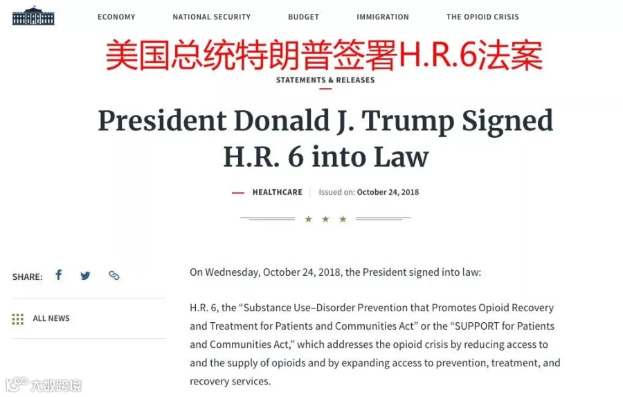 2018年10月24日的一份公告:特朗普已签署了一项名为H.R.6的法案,其旨在寻找治疗疼痛的替代性药物和疗法,遏制阿片类止痛药物在美国泛滥。