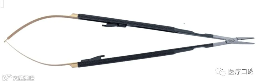 显微剪:用于剪开和修剪吻合口,直型头端可以剪出直线,很多显微手术的动脉非常细软, 很难用刀片划开,多数都只能用显微剪剪开。直头显微剪有利于剪出整齐的吻合口,这种剪 刀要求非常锋利,否则容易损伤血管,形成锯齿状边缘。Stille 的 117-A110 显微剪就是非常 受欢迎的精细显微剪刀,广泛用于各种显微手术。
