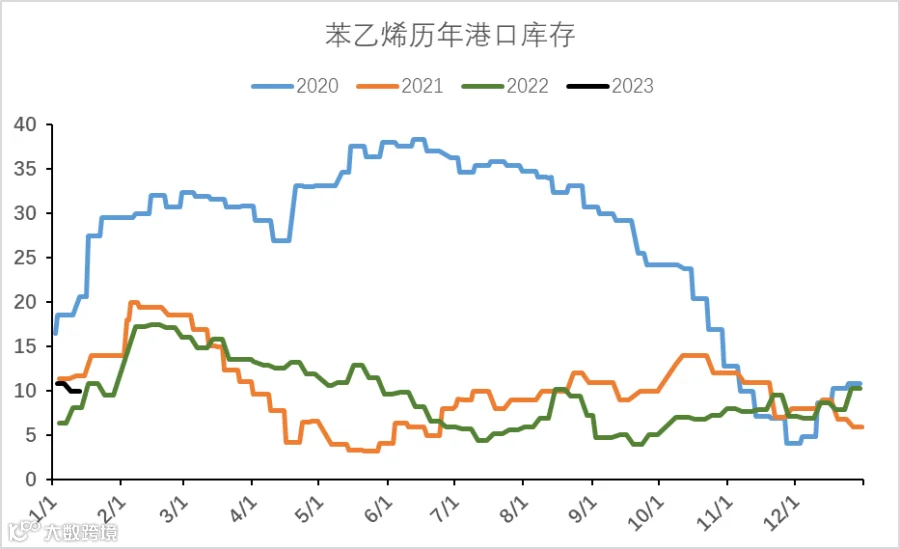 当前纯苯江苏港口库存为23.84万吨(+0.65),持续累库,库存量已达历史高位,供应偏宽松,苯乙烯-纯苯价差已扩大到1800以上。
