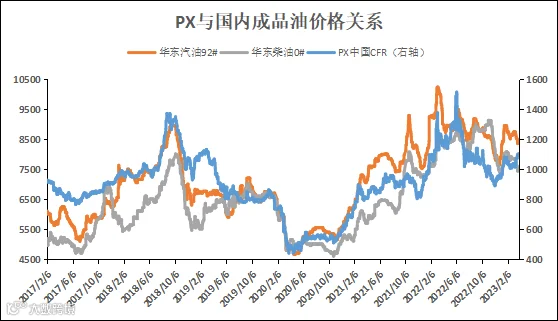 PX的价格走势与国内成品油十分相似。