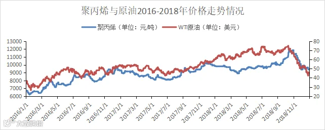 第二阶段是2016年到2018年,聚丙烯价格整体震荡走高,直至最后一季度出现快速下跌的情形,这一时间段内曲线依旧与原油相似。