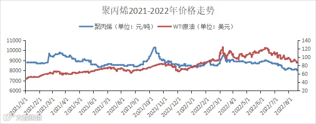 最后一个阶段是2021年到2022年,这一时期全球疫情依然肆虐,地缘政治风险加大,市场复杂程度加深,聚丙烯与原油走向也并不相似。