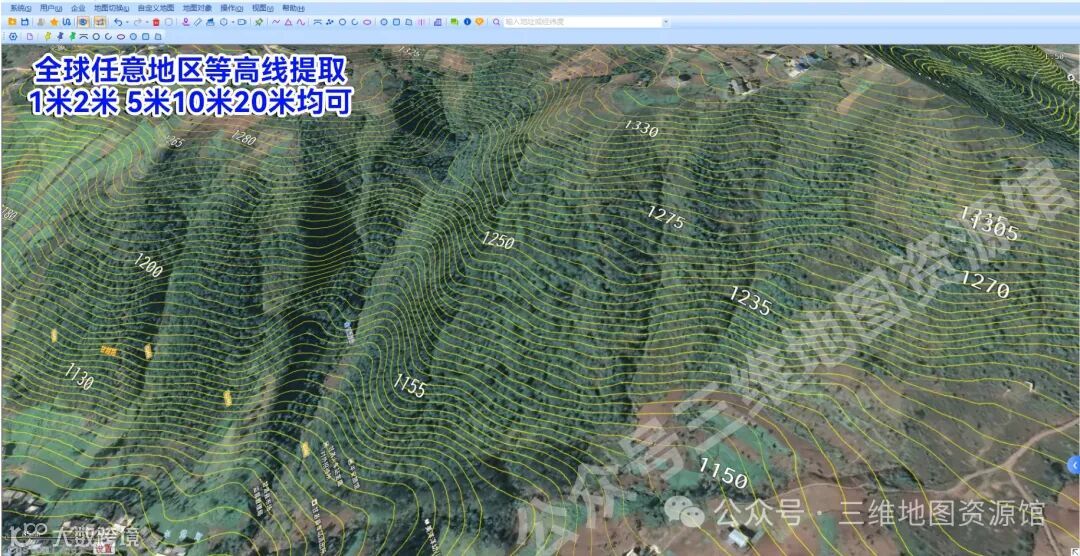支持三维地形与等高线叠加显示。