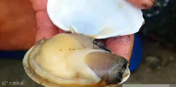 一面壳较突出,黄白色,一面壳稍平,较另一面壳稍小。