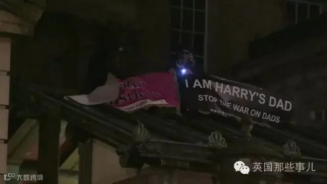 2015年,两个主张维护父亲权力的活动家爬上白金汉宫的房顶拉横幅
