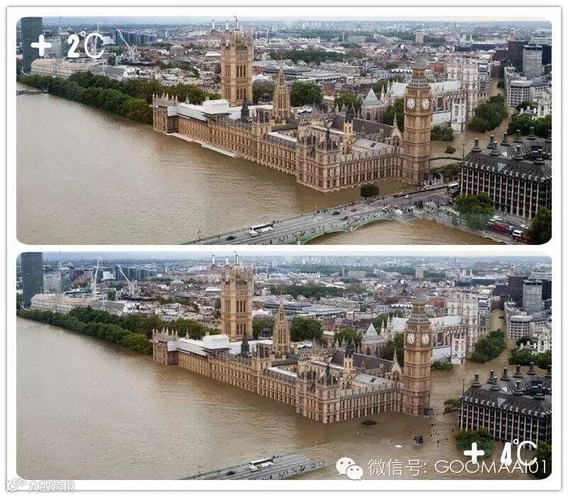这些预测照片时时刻刻在告诉人们,2度和4度绝不是简单的小小数字,而是有可能使我们赖以生存的生态环境和家园发生翻天覆变化的巨大力量。