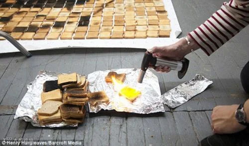 美国艺术家Henry Hargreaves通过烘烤便成为了手工艺名人。亨利用烧焦的900片面包做出了披头士乐队成员,女王和巨星玛丽莲·梦露的肖像。他使用焦糖布丁火炬精心烘烤面包,然后再将他们铺设到工作室的地板上。