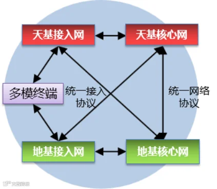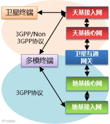 星地融合的混合接入阶段。通过卫星互通网关实现卫星接入与地面接入互补,地面控制与星上控制并存;卫星和地面沿用现有技术,通过接口互通和信息交互实现两张网络按需选网提供服务;两张网络独立发展,网络协议可以相同或不同,可以通过多模终端选择接入。