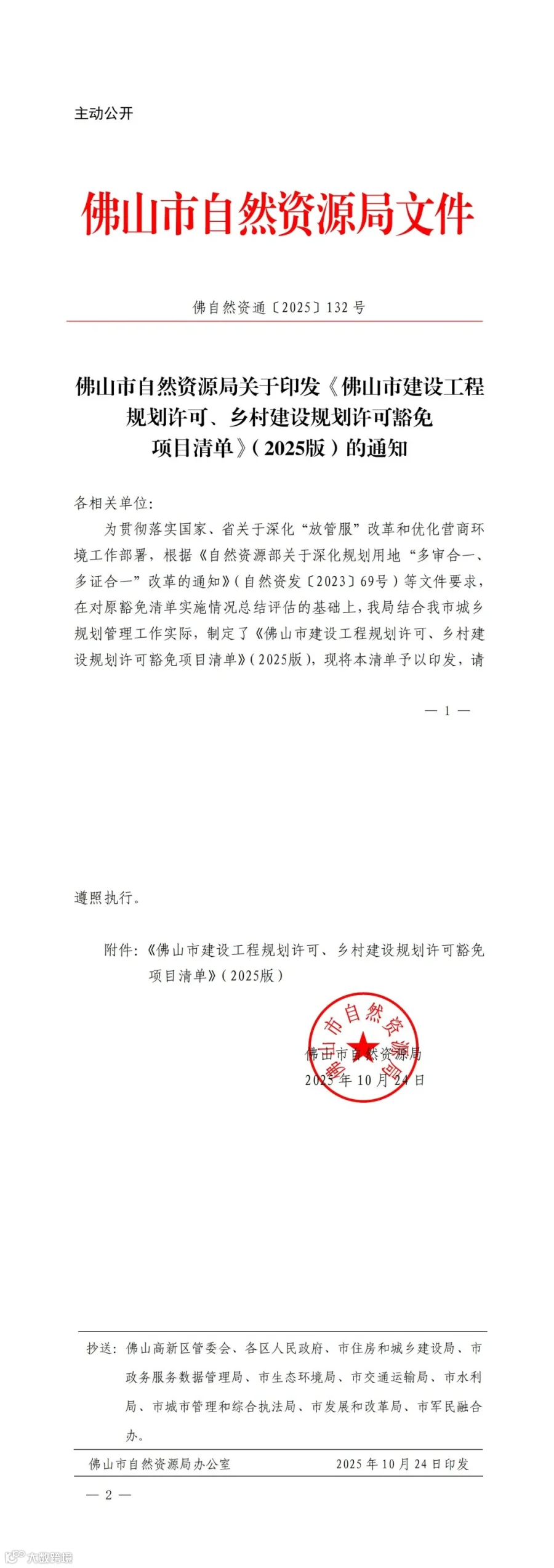 佛山市自然资源局关于印发《佛山市建设工程规划许可、乡村建设规划许可豁免项目清单》(2025版)的通知