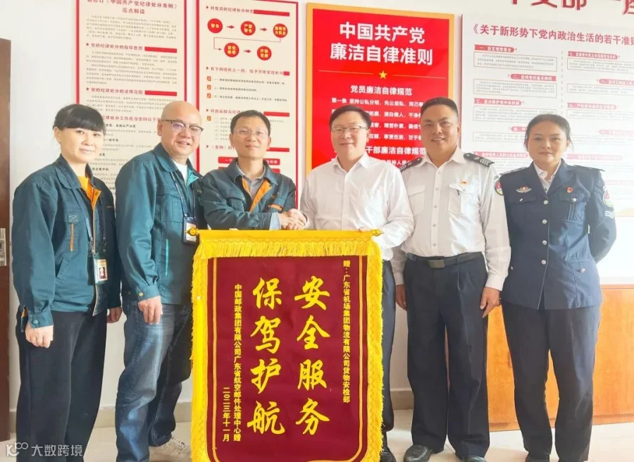 近日,物流公司货物安检部收到了来自中国邮政集团有限公司广东省航空邮件处理中心赠与的“安全服务、保驾护航”锦旗,感谢物流公司自邮政枢纽中心建设以来为其提供的春风服务。