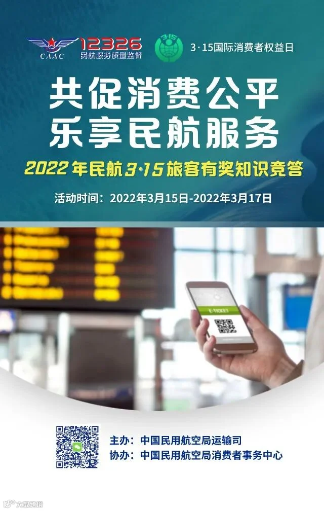 3月15日早上8时起开展有奖知识竞赛活动(扫描图片内二维码即可参与)。知识竞赛内容主要包括民航服务工作成就、工作目标、航空旅行常识、疫情防控提示等方面的知识。
