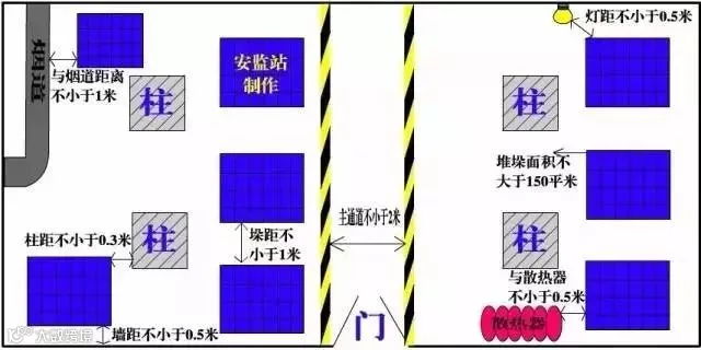 (1)每垛占地面积不应大于100 m2;(2)垛与垛的间距不小于1m;