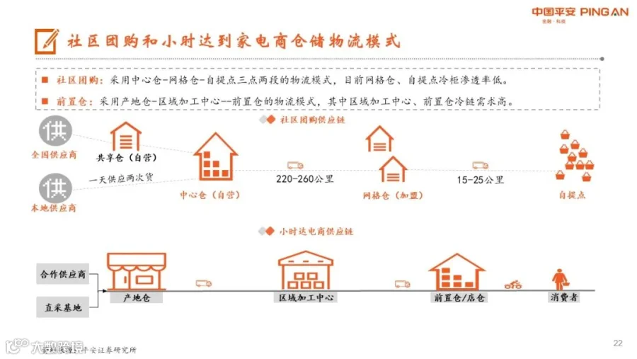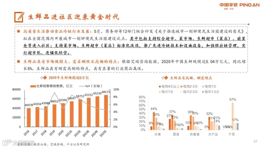 生鲜电商高速发展,冷链需求旺盛:2020年中国生鲜规模达5.04万亿元,其中生鲜电商渗透率只有9.1%,但疫情显著推动了生鲜电商的高速发展,预计2021年生鲜电商规模将达到6705亿。按时效和城市线级主要生鲜电商业态可分为三大类,即小时达电商、次日达电商和次日以上达的传统电商。预计2021年社区团购规模将达4000亿以上,小时达电商规模将达到2010亿。假设生鲜电商中冷链需求规模占交易额25%,则2021年生鲜电商冷链需求将超1600亿元。