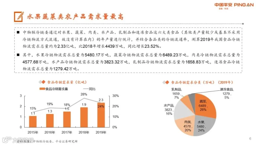 冷链物流行业持续增长:2019年我国冷链物流行业的市场规模达到3391亿元,同比增长17.5%,连续多年保持增长,其中食品冷链占比近90%。2019年我国食品冷链物流需求总量约为2.33亿吨,比2018年增长4439万吨,同比增长23.52%,其中果蔬占比超过50%。