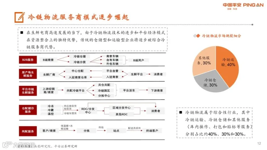 综合冷链服务商崛起:随着冷链物流技术的进步和平台经济模式在资源整合上的独特优势,传统的仓储型和运输型企业将逐步被综合冷链服务商代替,当前冷链物流领域百强企业中,大部分企业业务涉及4-7个冷链相关子业务,行业头部企业的市占率也在逐年提升,至2020年百强企业市占率已经超过18%。