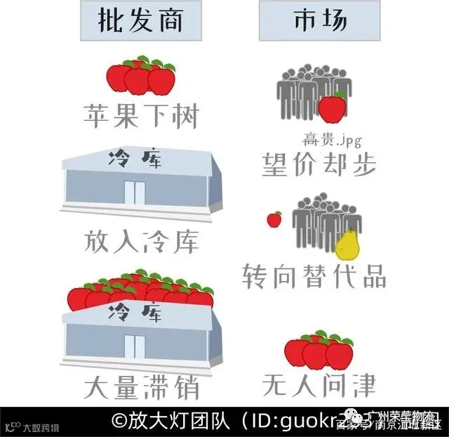 大量囤货不仅人为抹去了苹果的销售“旺季”还因为破坏供需关系造成市场的恶性循环:收获初期价格虚高→苹果入库囤货待涨→库存堆积价格下跌。