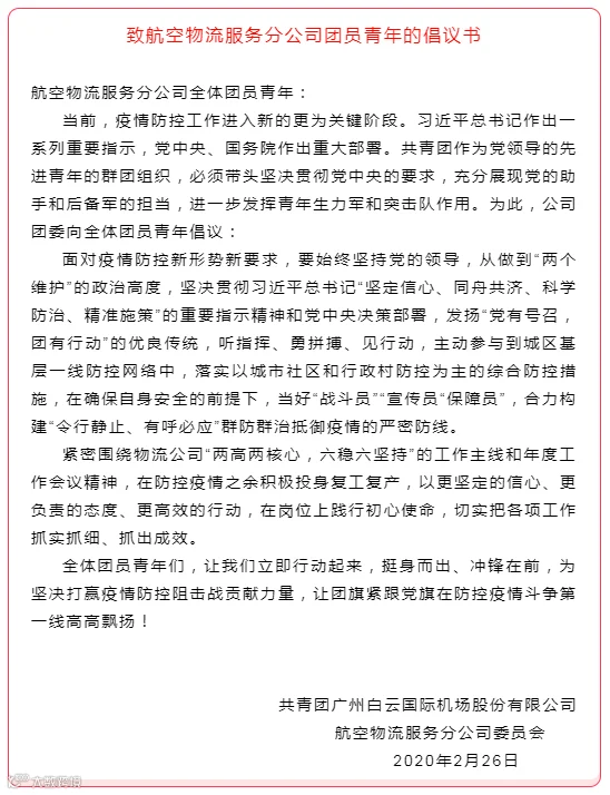 当前,疫情防控工作进入新的更为关键阶段,物流公司各级共青团组织和广大团员青年积极响应号召,公司团委发出《 致物流分公司全体团员青年的倡议书》,发扬“党有号召、团有行动”的优良传统,充分发挥青年生力军和突击队作用,以实际行动落实“一手抓防疫、一手抓生产”的要求。