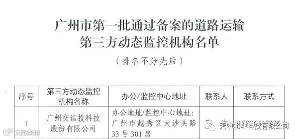 为开展《广东省交通运输厅关于印发道路运输车辆智能监管系统应用管理办法(试行)的通知》粤交[2021]13号文件里面管理办法,广州交信投向交通运输主管部门递交了第三方监控机构备案申请,并成功通过了广州市第一批道路运输第三方动态监控机构备案。