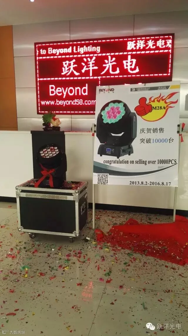 面对日益激烈的竞争和挑战,跃洋光电M28A自2013,8,2-2016.8.17以来能获得突破10000的喜人成绩。这张骄人的成绩单要感谢广大新老客户对跃洋光电的长久支持与信赖,当然也和我们背后强大的销售团队,技术团队,产品优势密不可分,相信,通过跃洋光电孜孜不断的努力发展将会很快创造出下一个佳绩Facing with nowadays fierce competitions and challenges day to day , M28A 19X15W 4in1 zoom moving head had already sold over 10,000 pcs from 2nd August,2013 to 17th August,2016 in Guangzhou Beyond Lighting Co., limited. This amazing result benefits from all of you, our dear clients .Because of you and your durable support and trust , related with our stronger sale team, technology team and advantages of M28A,we have this excellent score. We believe that Beyond can continue to make another big surprise with our hard working .
